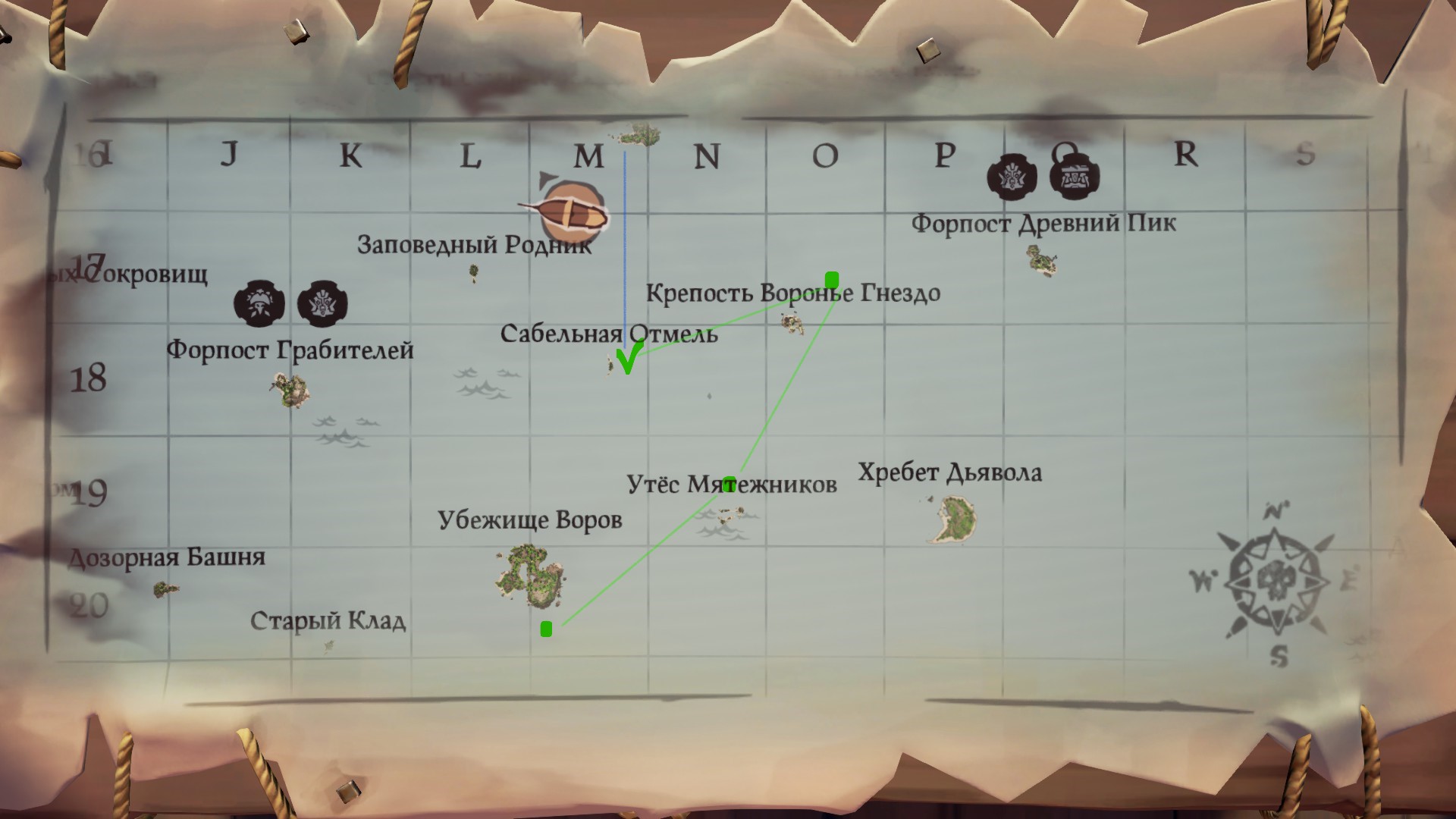 - Юг острова "Убежище воров" (L20) => "Сабельная отмель" (M18)