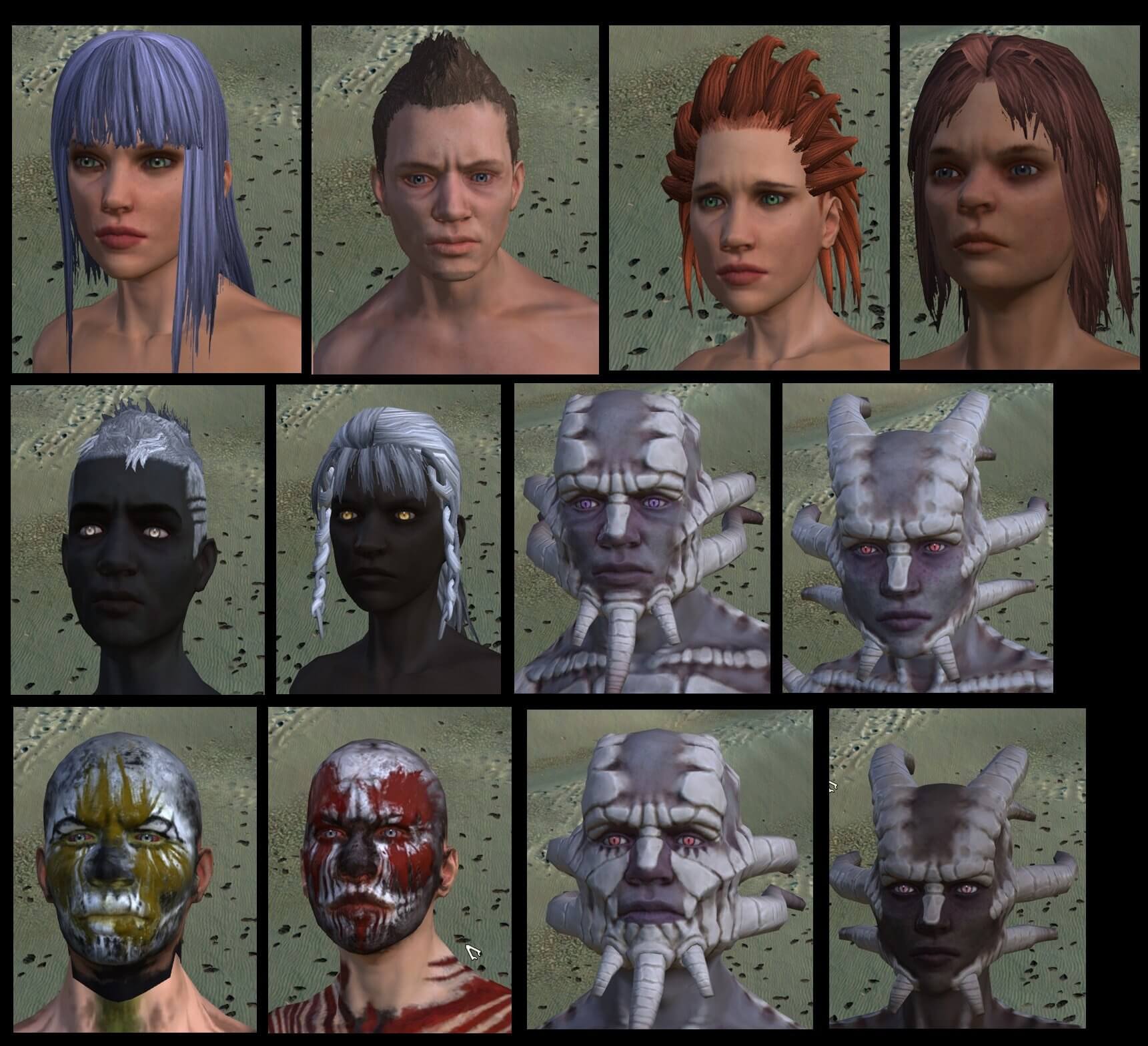 Переработанные лица и количество глаз (базовые + пользовательские) : Шеки (18+8) Жженоземцы (6+9) Зеленоземцы (18+16) Западный улей (0+5) Южный улей (0+1) Каннибалы (2+0) Дикие каннибалы (2+0) = ИТОГО : 85 (46+39)