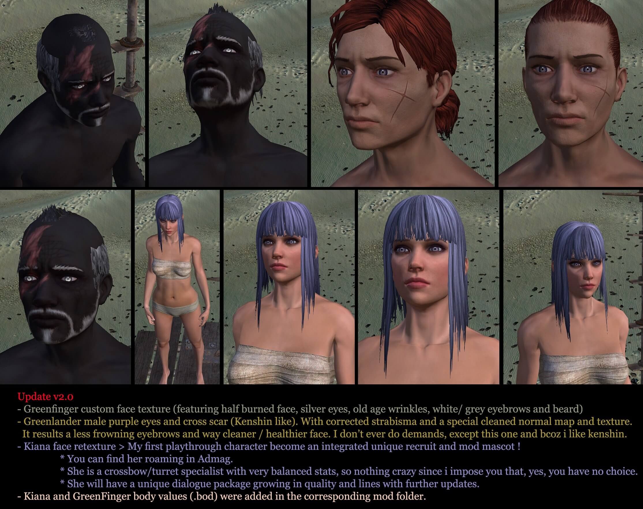 Он должен быть на 100% совместим с любым модом, который не затрагивает ванильные текстуры лица (так как я также изменяю/исправляю их или меняю их отображаемое имя). Может работать со старым сохранением, но некоторые аспекты мода не будут активированы (все предустановки тела и пользовательские лица не будут автоматически установлены для новобранцев).