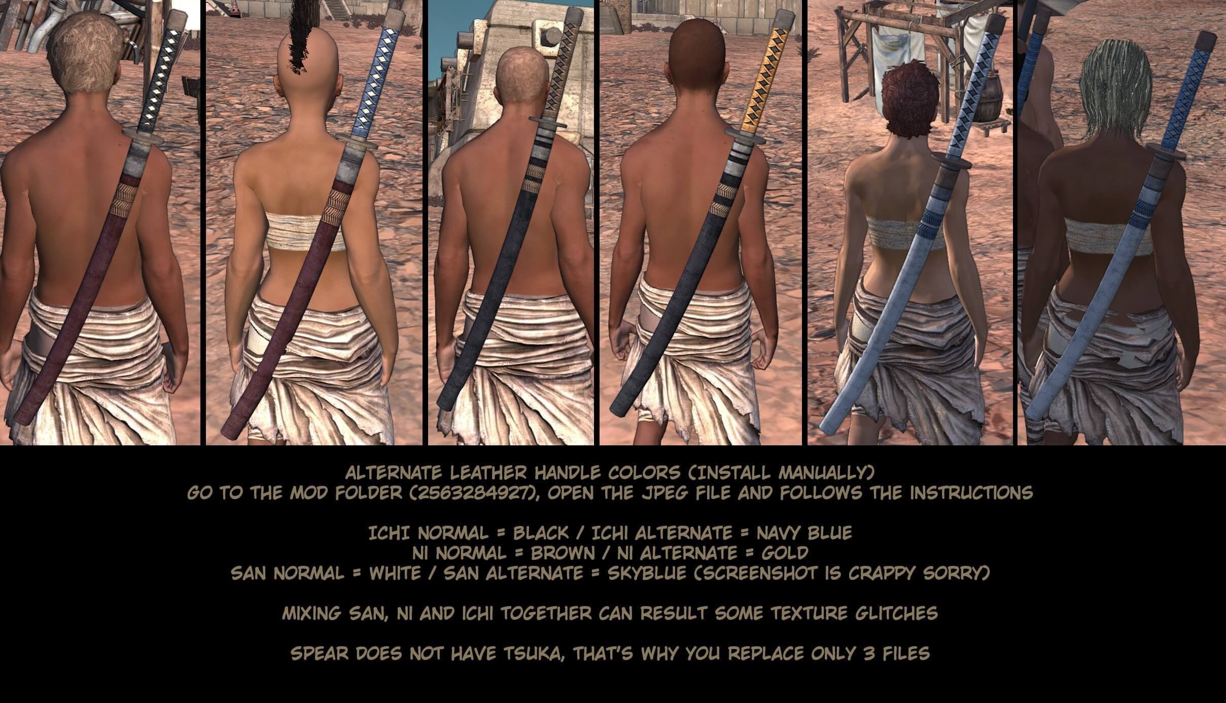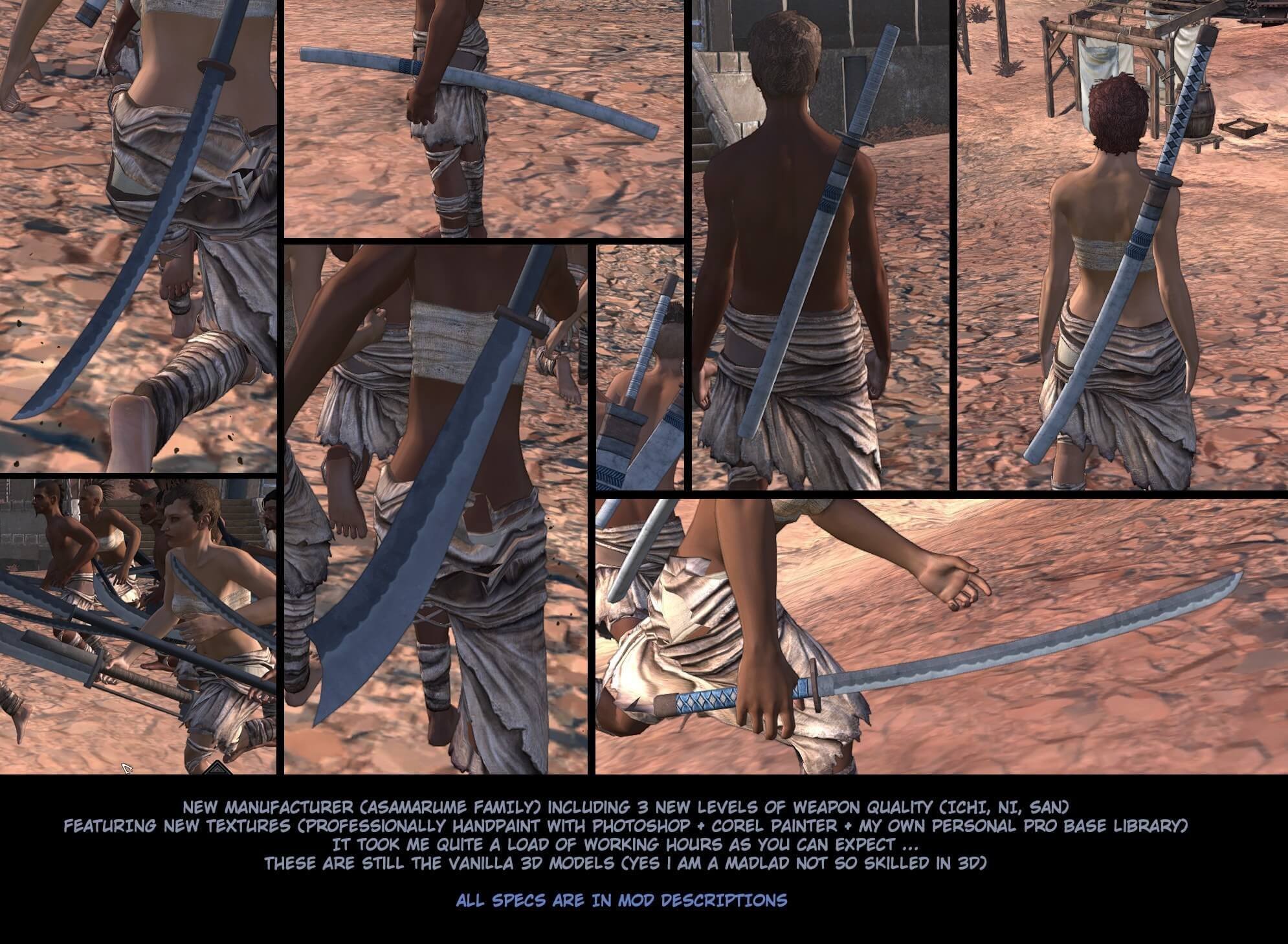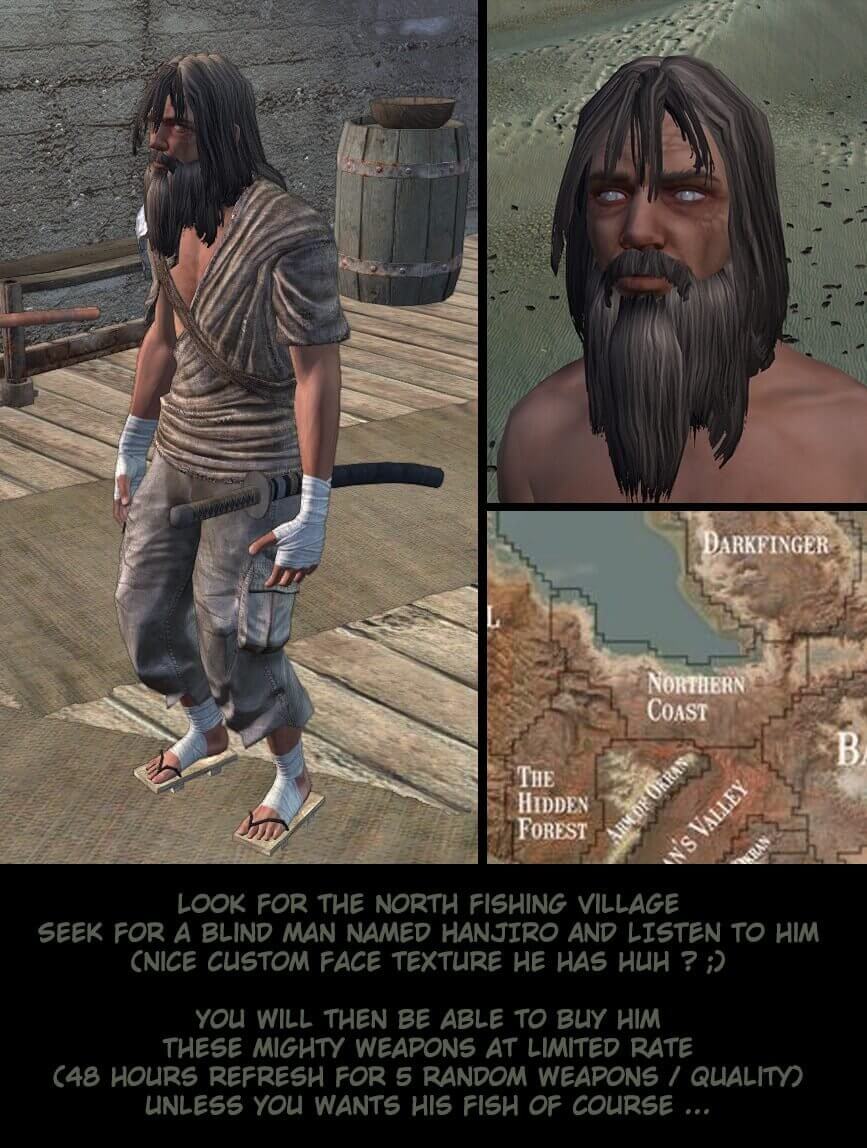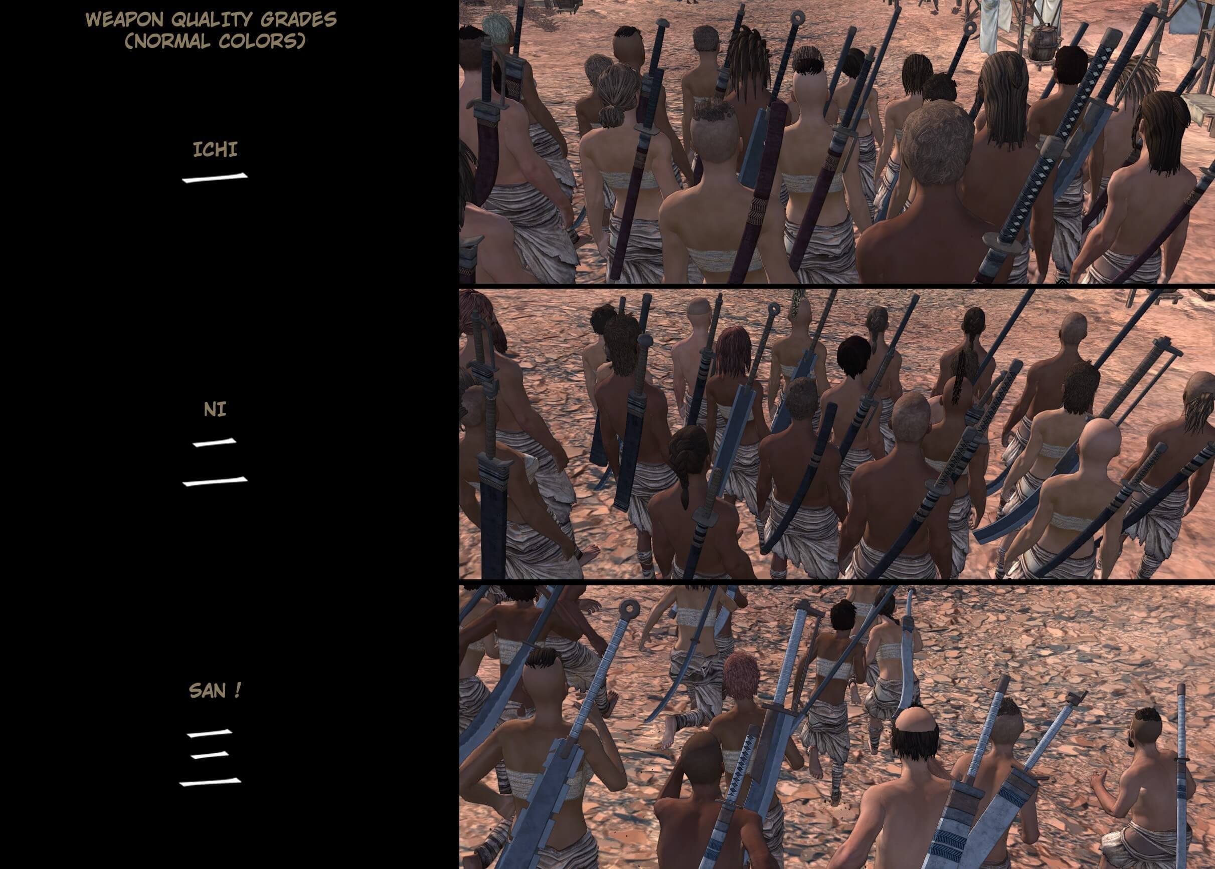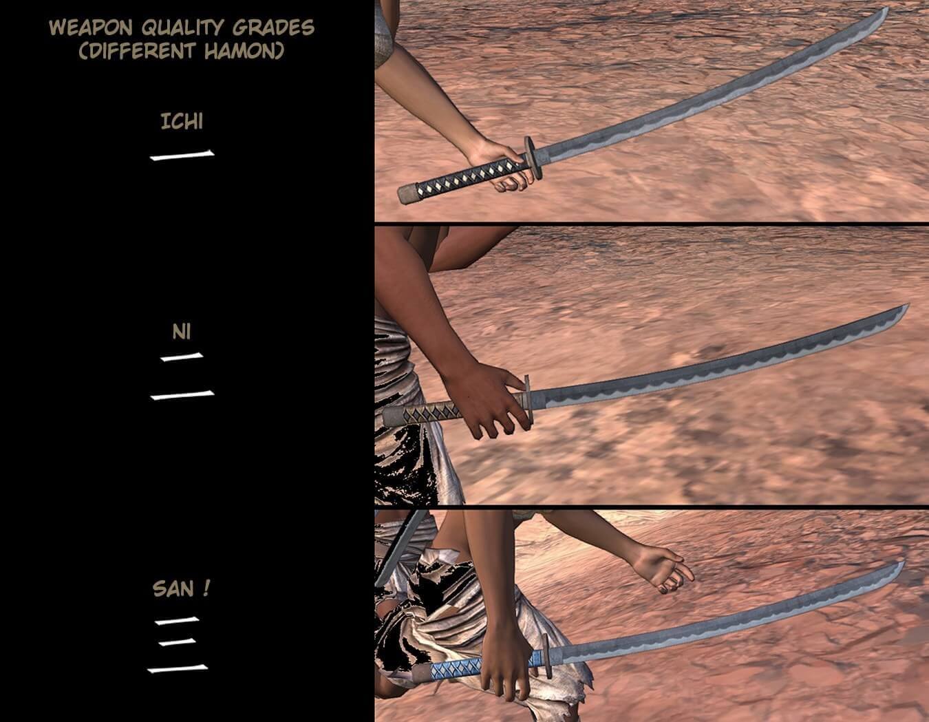 Этот мод предлагает новый набор ванильного оружия, с тремя классами качества: Ичи, Ни, Сан, отделены соответственно уровнями на 45, 65 и 85lvl. Каждый из них имеет совершенно новые текстуры. Это оружие можно купить только у торговца, которого нужно искать в северной Рыбацкой деревне.