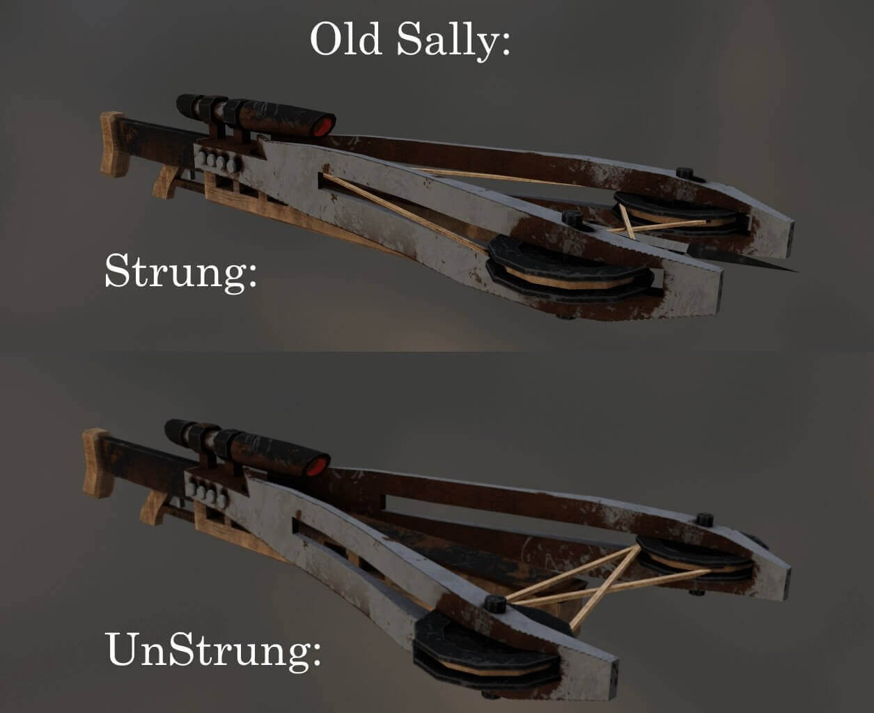 Старая Салли: Изготовленный на заказ арбалет Ксавейджа, который является грубым прототипом ротанговой диаграммы, найденной им в развалинах много лет назад.