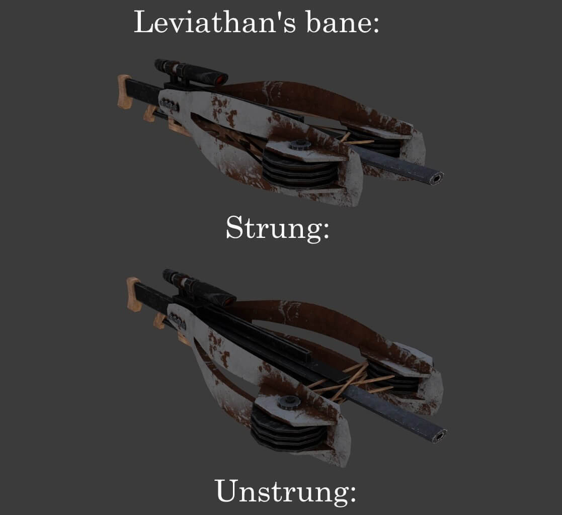 Бич левиафанов: Абсолютно массивный арбалет, который ставит в тупик любой другой арбалет. Требует 4 уровня исследования для приобретения и является значительной инвестицией.