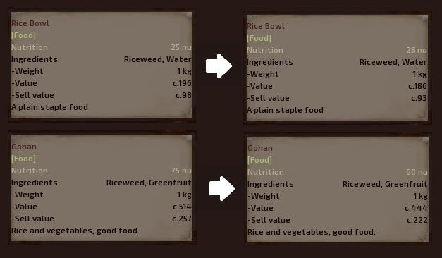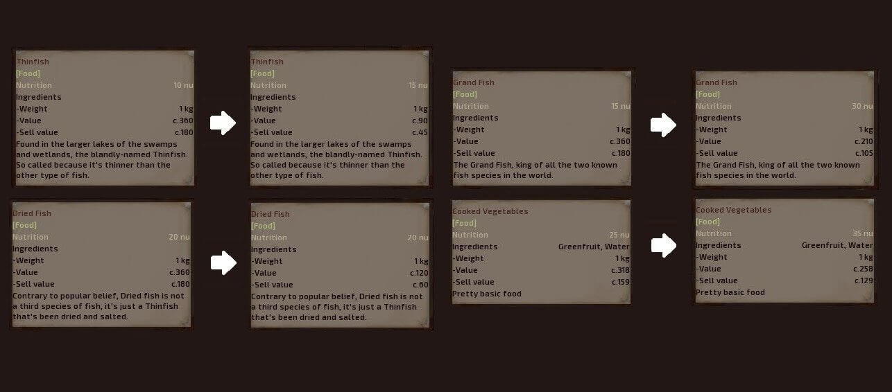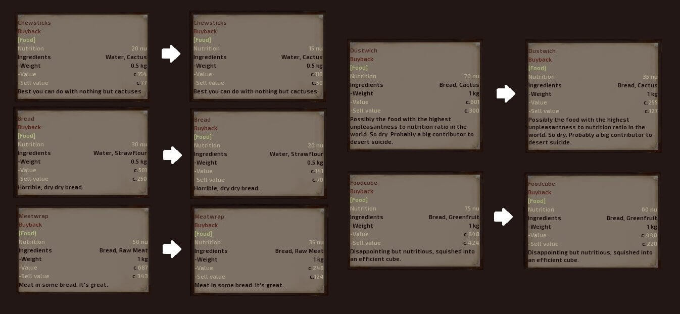 До этого мода автор в основном использовал сушеное мясо, потому что это была самая эффективная еда, если учитывать предыдущее соотношение цена / питание по сравнению со всеми остальными. Но этот мод изменяет цены на продукты и питание, чтобы, они были более сбалансированы с точки зрения выживания и общего игрового процесса. Так что теперь у игрока есть больше стимулов использовать много видов пищи вместо только сушеного мяса.