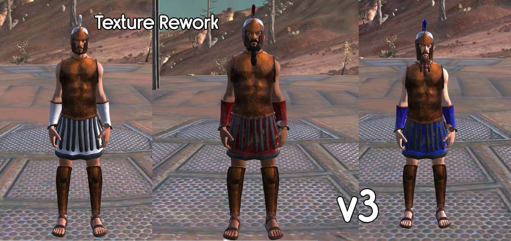 Мод добавляет набор спартанских доспехов, средний сет брони. Вся статистика сбалансированная.. Чертежи доспехов можно приобрести у продавца священных доспехов. Как и было обещано автором, есть три отдельных цветовых варианта: красный, синий и белый.