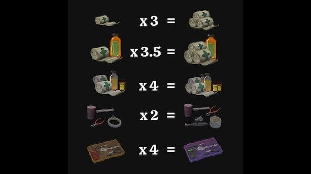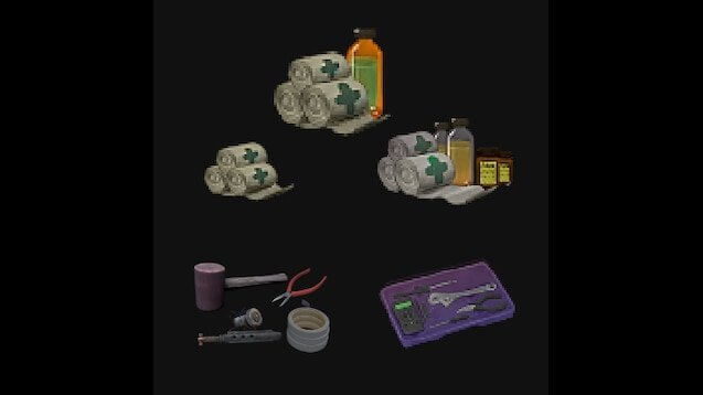 Враги спавнятся с ванильными аптечками. Статы ванильных аптечек остались без изменений. Таким образом мод не ломает экономику. Если бы мод менял ванильные предметы, то залутав 7 скелетов можно было бы заработать 200к только продавая ремкомплекты.