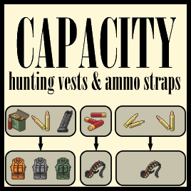 Пока разработчики заняты более важными делами, такими как, перерисовыванием огня третий раз к ряду, множество вещей в PZ работают просто отвратительно. Например в игре патронташ - слегка увеличивает скорость зарядки оружия, великолепная идея не правда ли? А охотничий жилет - не более чем мусор (ну не совсем, но в целом). Capacity vest and ammo straps исправляет это недоразумение, теперь в патронташе можно хранить патроны(и только их), а охотничьи жилетки выполняют роль разгрузок, но не пытайтесь положить в них что-то тяжелее обоймы от вашего старенького кольта M1911.