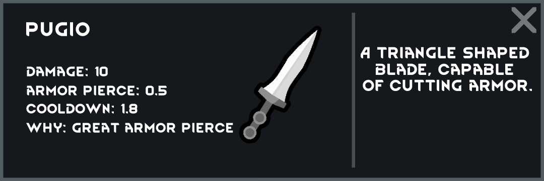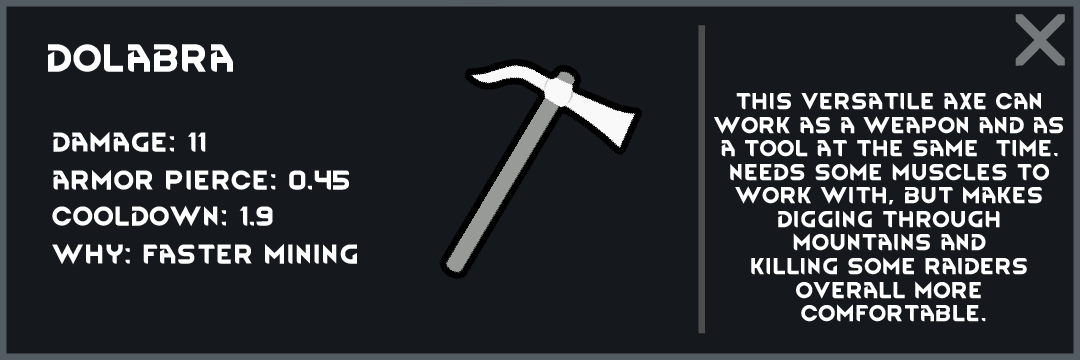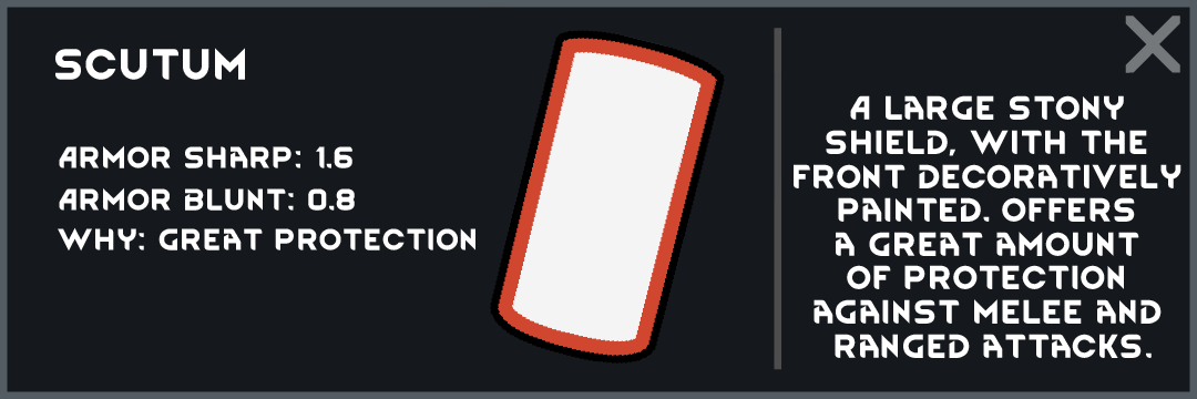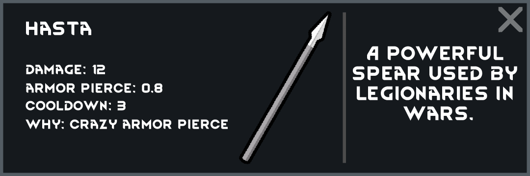 - Мод направлен на добавление оружия, которое использовали римляне в игру Rimworld. В данный момент добавлено 6 новых предметов, 4 ближнего оружия, 1 метательное и 1 щит