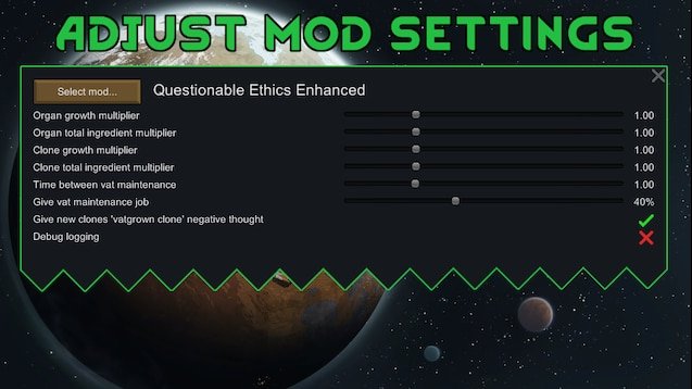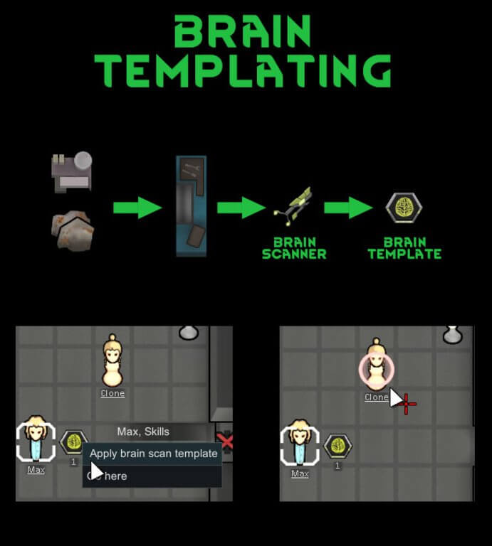 После того как клон вырос в панели здоровья имеется метка "Clone". Она нужна для Brain scanner так как шаблоны можно применить только на клонов. Также клоны имеют нулевые параметры и нужно сканировать мозг с помощью Brain scanner. Тогда у вас появится шаблон навыков, который вы сможете применить. Также клоны имеют дебаф настроения -20, но он продержится примерно 3 дня и смениться на дебаф -3, который также пропадет со временем. Клон растет 22 дня, но изменив множитель в настройках мода время роста измениться.