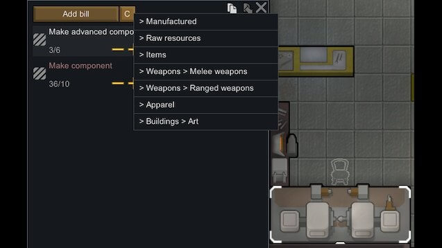Мод Categorized Crafting Bills добавляет небольшую кнопку на каждую вкладку рабочего места, которая представляет доступные предметы в серии подменю, поэтому вам не нужно искать ее во всем списке.