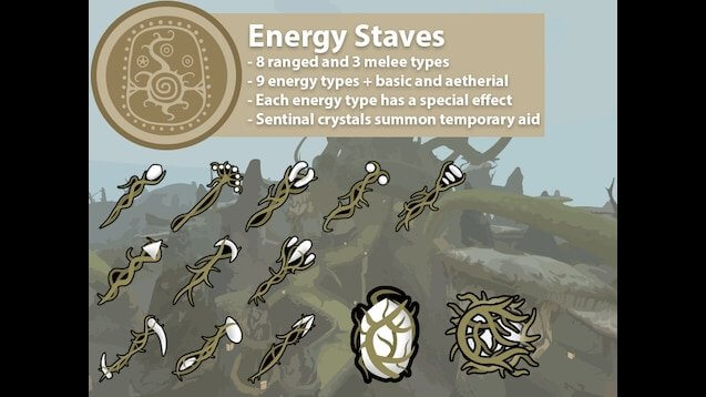Энергетические посохи-новое и довольно мощное оружие. Они бывают в самых разных формах, как в ближнем бою, так и в дальнем. Они могут быть созданы с использованием различных солей и экстрактов, наполняя посох дополнительным эффектом и новым типом урона.