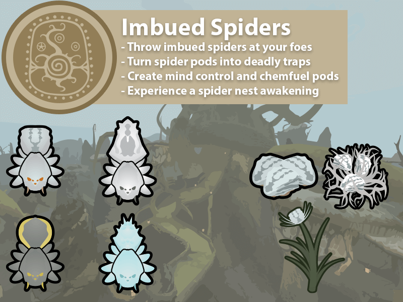 После получения стручки пауков можно пропитать определенными элементарными солями и экстрактами на столе для пропитывания пауков. В результате будет создан новый пояс, который позволит вам бросать пауков в врагов или в места. Пауки, брошенные в цель, начнут автоматически атаковать цель, тогда как пауки, брошенные в места, будут делать все, что они решат.