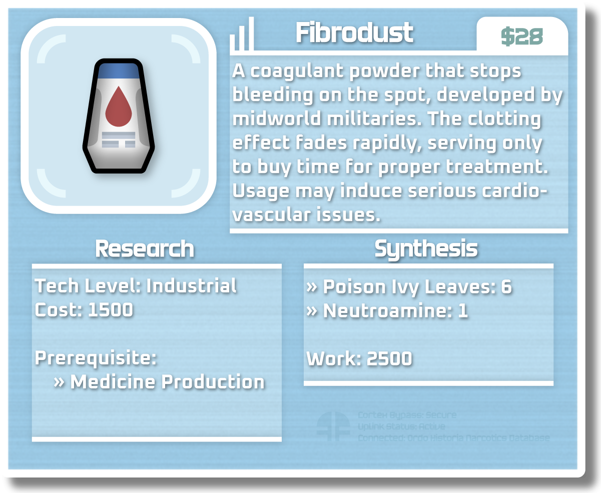 Порошок коагулянта, останавливающий местное кровотечение, разработанный вооруженными силами Среднего мира. Эффект свертывания крови быстро исчезает, что позволяет лишь выиграть время до надлежащего лечения. Использование может вызвать серьезные проблемы с сердечно-сосудистой системой. - "Коса"