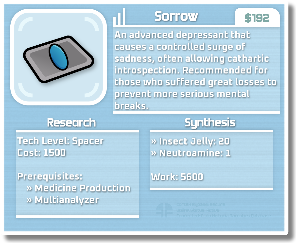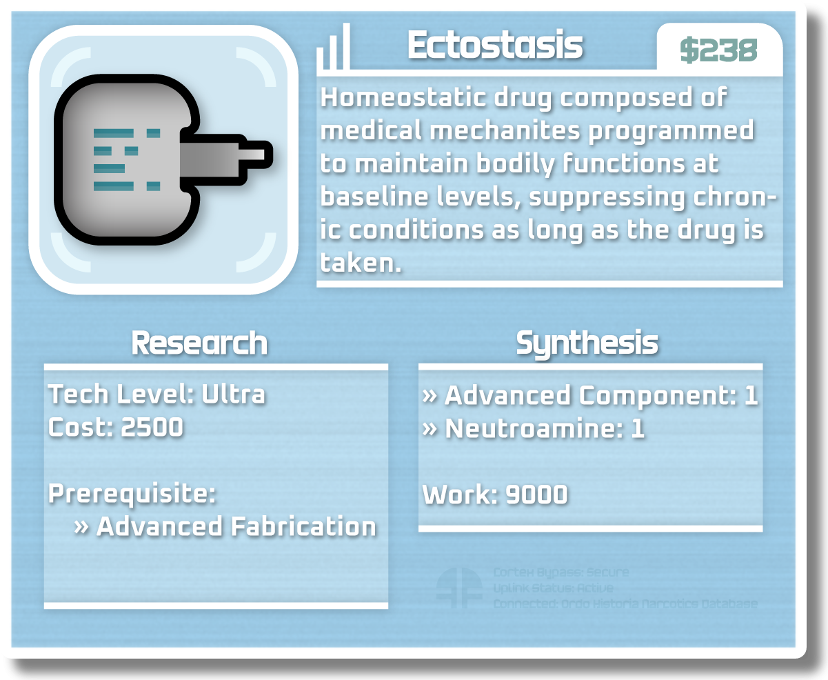 Продвинутое успокаивающее, которое вызывает контролируемую волну грусти, часто сопровождающуюся катарсическим самоанализом. Рекомендуется тем, кто страдает от перенесенной утраты, для предотвращения более серьезных психических срывов. - Эктостазис