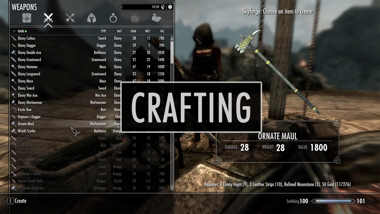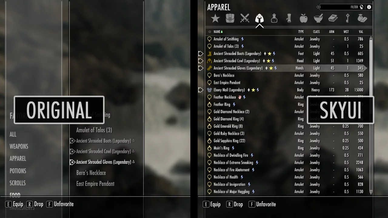 Мод перерабатывает интерфейс Скайрим ,делая его более удобным и приятным глазу. Новый интерфейс распространяется не только на инвентарь, но и на окно торговли и кузнечного дела, меню избранных вещей так же переработано.