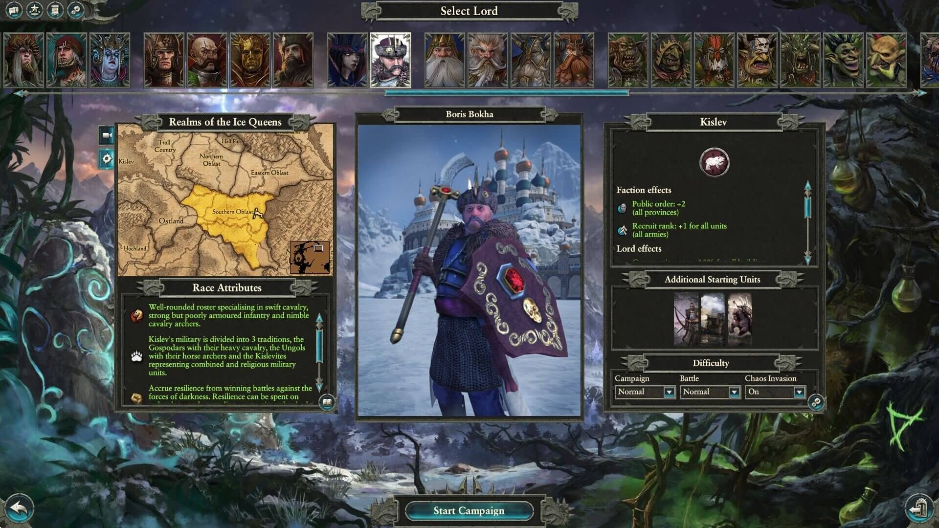 Все наверное знают такую в данный момент обделенную фракцию как Кислев в Total War Warhammer II. За нее нет возможности поиграть, а если вы используете анлокер, то играете за такую же не отличительную империю. В общем, в данной статье я предоставлю ссылки на моды которые дадут вам вполне насладиться игрой за Кислев на русском языке.
