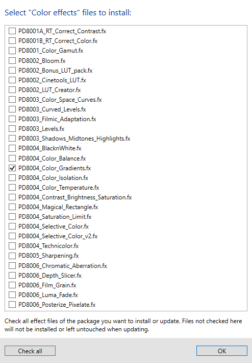 - 5) Когда это будет сделано, нажмите ОК. Теперь пришло время выбрать только те эффекты, которые я использовал, чтобы не загромождать ваш компьютер бесполезными файлами. Следуйте картинкам ниже. (Нажмите «снять все отметки» внизу каждого окна, чтобы избежать загрузки нежелательных эффектов)